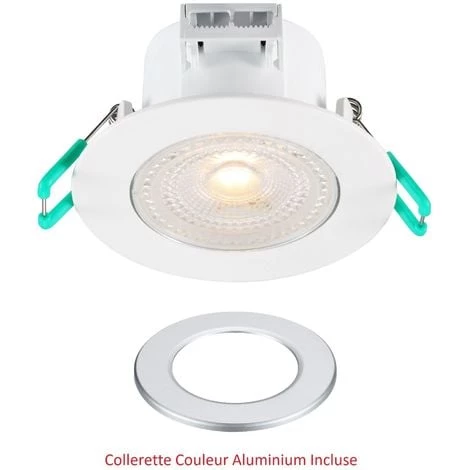 SPOT ENCASTRE LED ORIENTABLE 5W IP44 SYLVANIACette gamme de spot offre un excellent rendu et une bonne efficacite lumineuse. Le spot en IP44 est une solution ideale pour l’eclairage d’environnements humides comme les salles de bains. Afin de faciliter son installation le spot est equipe d?un boitier de repiquage.Ce spot est IP44 et orientable avec un design de la lentille unique.L?angle de diffusion de ce produit est de 38 degre. Cela permet un eclairage precis et diffus.Le corps du spot est en polycarbonate ultra resistant.Son faible encombrement (47mm) le rend ideal pour une installation dans les faux plafonds de faible hauteur. Spot LED SYLVANIA encastre pret a etre installe.Ce produit developpe une puissance de 5W pour un rendu de 480 lumens.Ce produit dispose d’un indice de protection IP44, il peut donc etre installe dans toutes les pieces de la maison y compris les salles de bain et salles d’eau.En revanche il ne peut pas etre installe a l?interieur d?une douche.Le produit SYLVANIA LED est equipe d’une lentille de diffusion effet opaque. Ce spot encastre LED est livre avec une collerette couleur aluminium supplemantaire.Diametre d?encastrement de 65 a 74 mm permettant le remplacement direct de la plupart des spots halogenes presents sur le marche.Spot non dimmable