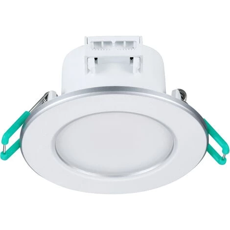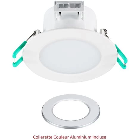 SPOT ENCASTRE LED 6.5W IP65 SYLVANIACette gamme de spot offre un excellent rendu et une bonne efficacite lumineuse. Le spot en IP65 est une solution ideale pour l’eclairage d’environnements humides comme les salles de bains. Afin de faciliter son installation le spot est equipe d?un boitier de repiquage.Ce spot est en IP65. Il est fixe (non orientable) avec une lentille depolie.L?angle de diffusion de ce produit est de 100 degre. Cela permet un eclairage de tres bonne qualite et large.Le corps du spot est en polycarbonate ultra resistant.Son faible encombrement (47mm) le rend ideal pour une installation dans les faux plafonds de faible hauteur. Spot LED SYLVANIA encastre pret a etre installe.Ce produit developpe une puissance de 6.5W pour un rendu de 600 lumens.Ce produit dispose d’un indice de protection IP65, il peut donc etre installe dans toutes les pieces de la maison y compris les salles de bain et salles d’eau.Il peut donc etre installe a l?interieur d?une douche.Le produit SYLVANIA LED est equipe d’une lentille de diffusion effet opaque. Ce spot encastre LED est livre avec une collerette couleur aluminium supplemantaire.Diametre d?encastrement de 65 a 74 mm permettant le remplacement direct de la plupart des spots halogenes presents sur le marche.Spot non dimmable