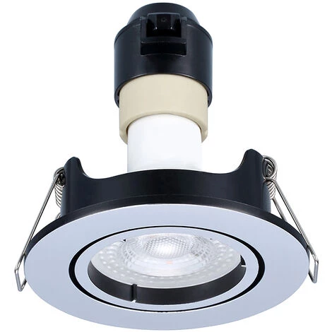 Spot LED encastrable GU10 Ø50mm. Corps en polycarbonate, lunette ronde finition chromée, inclinaison verticale 30°, degré de protection IP20, classe II. Flux lumineux 345lm, CCT 4000K, angle de faisceau 36°, puissance 4,5W, efficacité 77 lm/W, durée de vie 15.000h. Dimensions extérieures : Ø90x103mm, découpe Ø70-75mm. Convient uniquement pour l’environnement interne et pour les lampes LED uniquement.